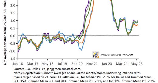 To get a sense of near-term trends in underlying PCE inflation I look at six-month averages of the annualized percentage point deviation of the above monthly central tendency inflation measures relative to their values as implied by 2% core PCE inflation. This is also consistent with public statements by Fed officials that they’d like to see sustained progress of inflation converging back to target, as measured over months and quarters of inflation progress.